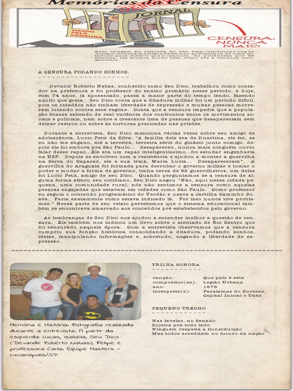 Nesse momento, também será indicada uma pesquisa sobre a família Petit da Silva, que moraram em Duartina, município vizinho à Lucianópolis, e conhecidos por muitas pessoas de nossa cidade. Os irmãos Maria Lucia, Jaime e Lucio participaram da Guerrilha do Araguaia e até hoje sua irmã Laura luta pelo direito de enterrar Jaime e Lucio. Também será disponibilizado textos das entrevistas realizada moradores da cidade para a 6ª ONHB, nas quais os entrevistados falam sobre os Petit da Silva e sua relação pessoal com eles. Com isso, pretende-se trazer a questão dos mortos e desaparecidos durante a Ditadura Civil Militar para mais perto do cotidiano dos alunos.