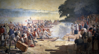 A pintura de José Ferraz de Almeida Júnior, como indica o título, representa a saída de uma monção, expedição fluvial que servia para o abastecimento de parte do centro-oeste do Brasil durante o século XVIII, período alto da exploração aurífera. A atual cidade de Cuiabá, por exemplo, se desenvolveu a partir desse contexto. Além dos rios, e dos aventureiros paulistas, vale ressaltar que o papel dos indígenas foi fundamental. Com eles os portugueses aprenderam as técnicas do fabrico das canoas, o hábito de dormir em redes, a navegação em pé na proa, as práticas de cura contra doenças e de males causados pela picada de animais, no conhecimento geográfico, no uso do arco e flecha, mais eficiente na defesa que as armas lusas do período etc. Para o historiador Sérgio Buarque de Holanda, por exemplo, que escreveu sobre o tema, a ideia de fronteira no Brasil do século XVIII se constitui nessas trocas culturais, o que demonstra a relevância dessa temática para o campo historiográfico. Por outro lado, a obra de Almeida Júnior se baseia no esboço do desenho Benção das canoas de Hércules Florence. No século XIX, Florence foi contratado como pintor da Expedição Langsdorff, iniciada em 1826, cujo objetivo era seguir até o norte do Brasil, por um percurso idealizado pelo Barão de Langsdorff, e que não se realizou completamente, em virtude de seus problemas mentais. Por fim, a obra de Almeida Júnior compõem junto com outras, de mesma temática o acervo de uma sala dedicada a essas expedições no Museu do Ipiranga, concebido por Afonso D. Taunay, seu diretor na primeira metade do século XX para ser o monumento de uma história nacional com foco na identidade paulista.