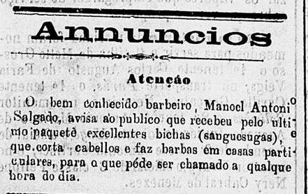 O bem conhecido barbeiro Manoel Antonio Salgado, avisa ao publico que recebeu pelo ultimo paquete excellentes bichas (sanguessugas), e que corta cabelos e faz barbas em casas particulares, para o que póde ser chamado a qualquer hora do dia.